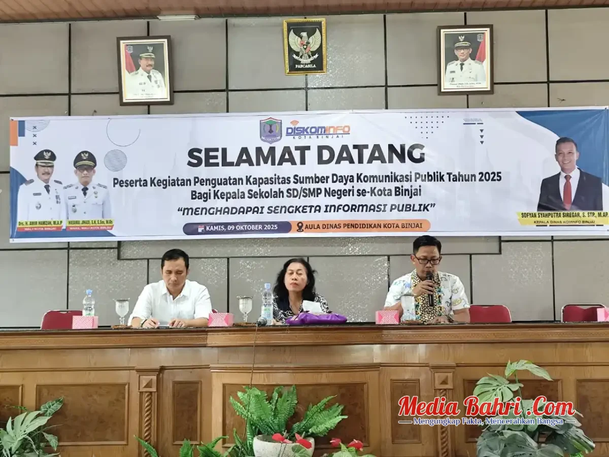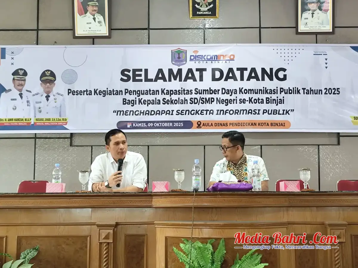 Mediabahri.com | Binjai – Pemerintah Kota Binjai melalui Dinas Komunikasi dan Informatika (Diskominfo) terus memperkuat komitmen terhadap keterbukaan informasi publik. Langkah ini diwujudkan melalui kegiatan Penguatan Kapasitas Sumber Daya Komunikasi Publik bagi para Kepala Sekolah SD dan SMP Negeri se-Kota Binjai, yang digelar di Aula Dinas Pendidikan, Kamis (9/10).