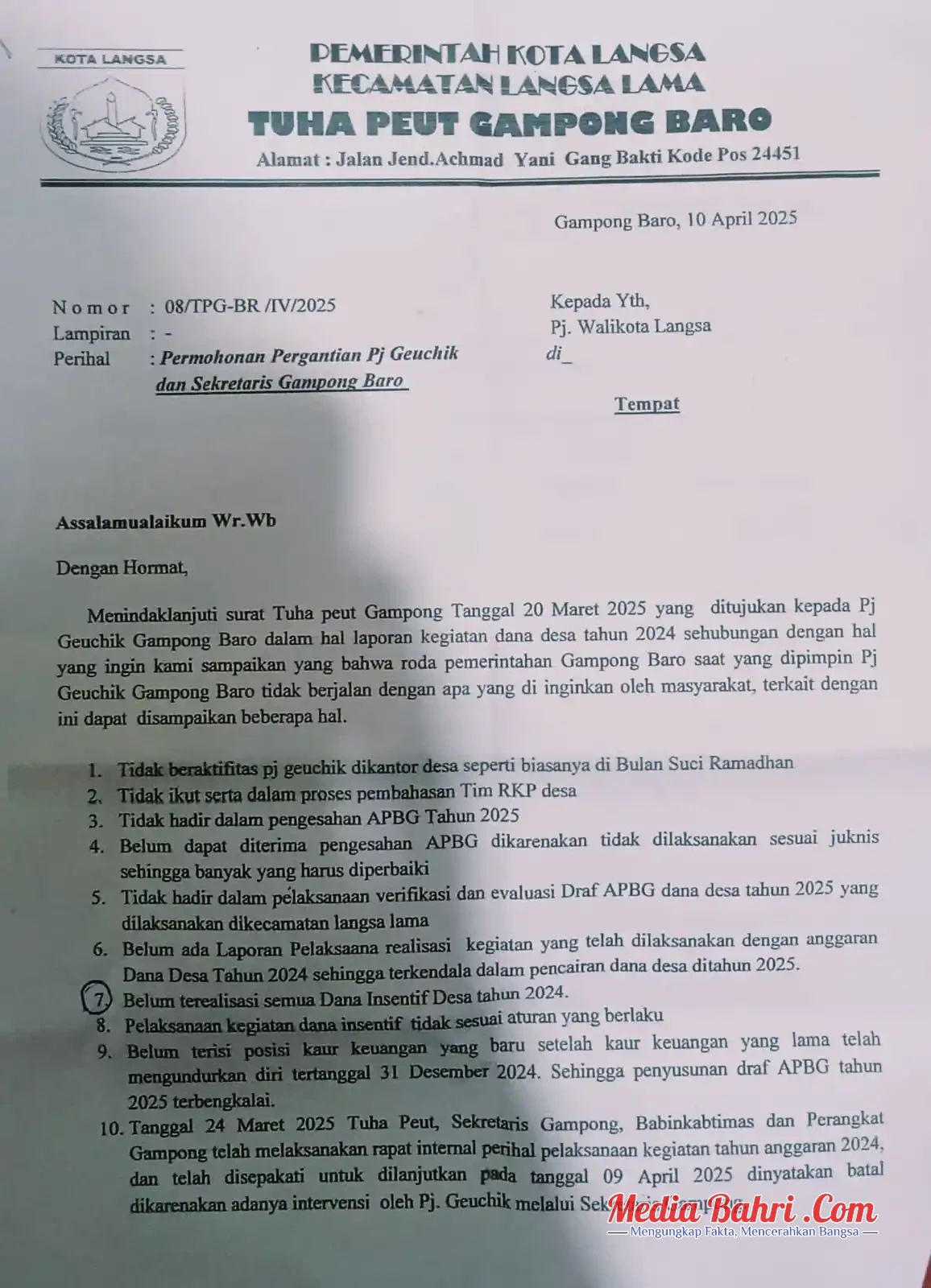 Mediabahri.com | Langsa Lama – Dugaan penggelapan dana desa dan pencemaran nama baik kembali mencuat di Gampong Baro, Kecamatan Langsa Lama, Kota Langsa, Provinsi Aceh. Mantan Geuchik Gampong Baro, yang akrab disapa Mahdi, menjadi sorotan setelah dituding melakukan penggelapan dana TPK senilai Rp81.354.000 pada tahun 2024.