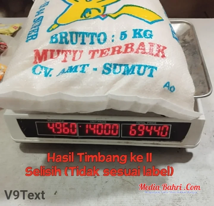 Berdasarkan hasil penimbangan awal oleh awak media yang dilakukan pada Kamis, 8 Januari 2026, beras kemasan yang diproduksi dan/atau didistribusikan oleh CV Agro Mitra Tani/Mitra Sembako, beralamat di Jalan Soekarno-Hatta, Kelurahan Tunggurono, Kecamatan Binjai Utara, menunjukkan berat bruto tercatat 4,960 kilogram saat dilakukan penimbangan pembanding menggunakan alat timbang digital.