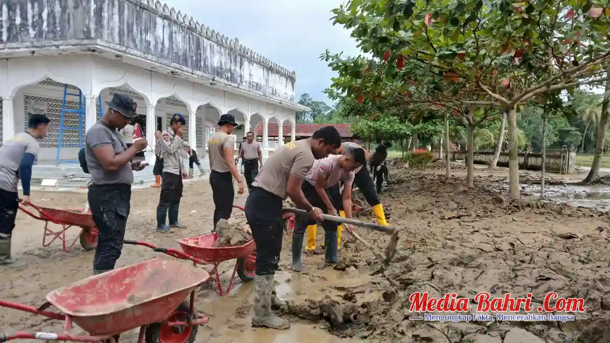 Koordinatorkegiatan, Ipda Kontan Turnip, S.Sos., M.H, memastikan seluruh unsur bekerja terpadu agar pembersihan berjalan aman dan efektif. Meski lantai masjid licin dan berlumpur, semangat kebangsaan tidak surut. Lumpur yang menumpuk dibersihkan hingga tuntas sebagai simbol bangkitnya harapan dan kebersamaan pascabencana.